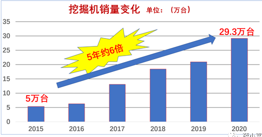 2020年,中国市场挖掘机国内的销售量是29.3万台,约是2015年的六倍,这是行业内外绝大多数人没有预料到的,挖掘机销售市场空前的繁荣。