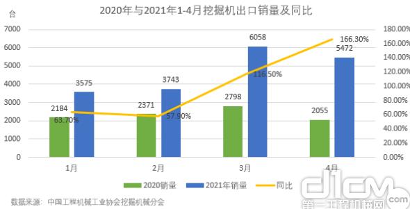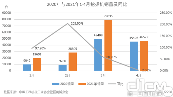 4月挖掘机销量数据出炉。据中国工程机械工业协会行业统计数据,2021年4月,共计销售各类挖掘机械产品46572台,同比涨幅2.5%,虽然不及此前行业咨询机构和媒体“同比增速在10.1%左右”的预期,但整体来看,行业增速与市场发展趋势吻合。