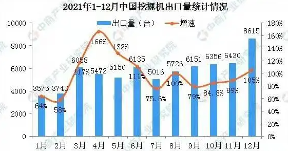 与疲软的国内市场相对应的是涨势正好的海外市场。2021年以来,得益我国疫情防控迅速,国产品牌出口市场迅速补位。加之我国企业国际化进程不断提速,海外工程和海外项目等业务不断拓展,挖机海外表现强劲,连续12个月出口销量“稳中有进”,各月最低同比涨幅57.9%,最高达166%。