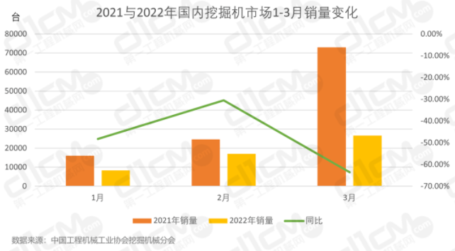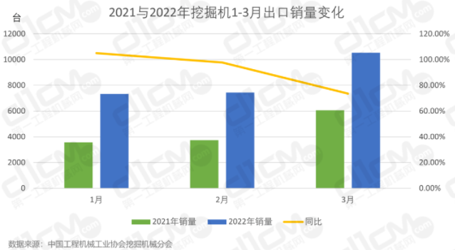 国内市场,3月挖掘机销量26556台,同比下降63.6%,国内需求依然乏力。除了受上年同期高基数因素影响,本轮疫情持续反弹导致我国经济下行压力不断增加,全国多地工地停工,叠加设备更新需求下行等也是3月国内挖掘机市场下游需求低迷的原因。